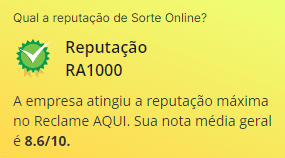 O índice de solução do Reclame AQUI considera apenas reclamações finalizadas e avaliadas - e a Sorte Online tem um grande percentual de demandas solucionadas por completo no site. Pelo bom desempenho, conseguimos a Reputação RA1000 na avaliação Geral dos consumidores!